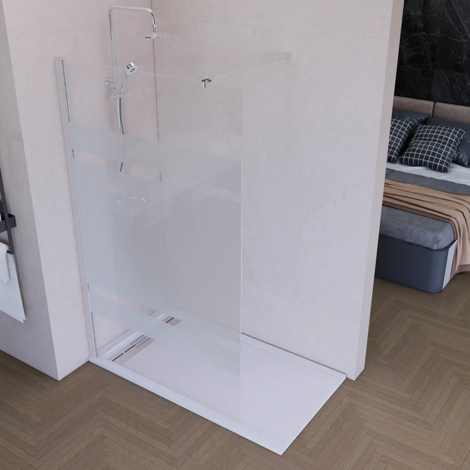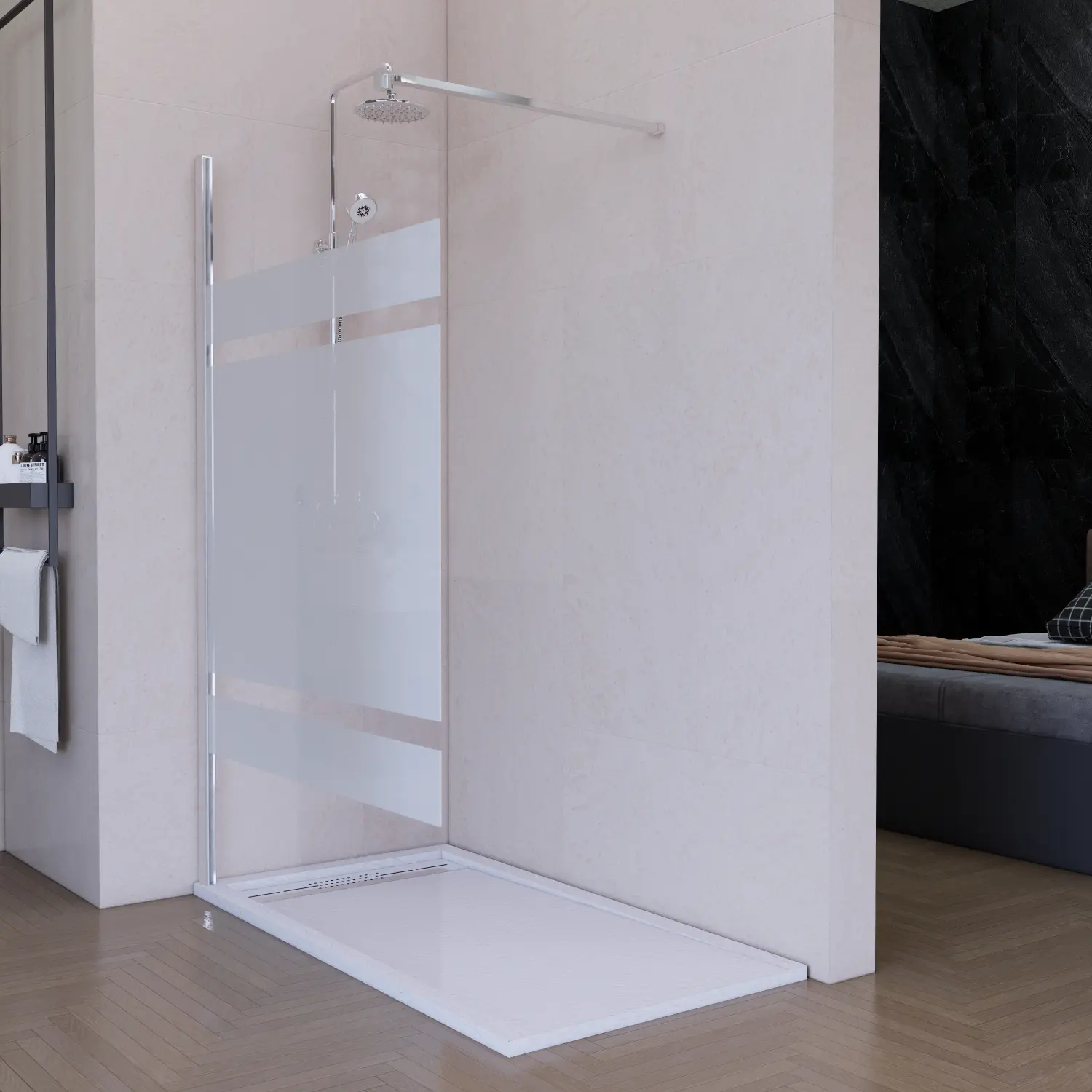 Mampara serigradiada con 3 franjas, las 2 mas finas tienen un ancho de 10cm y la banda gruesa un ancho de 64cm.