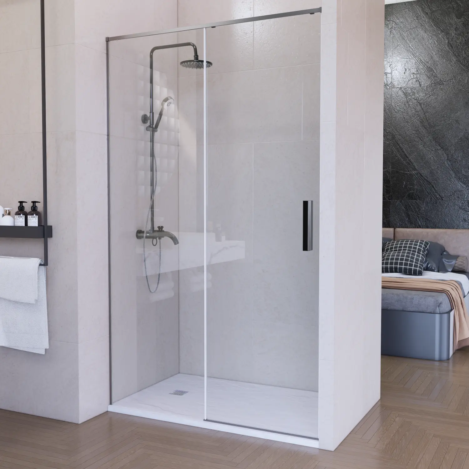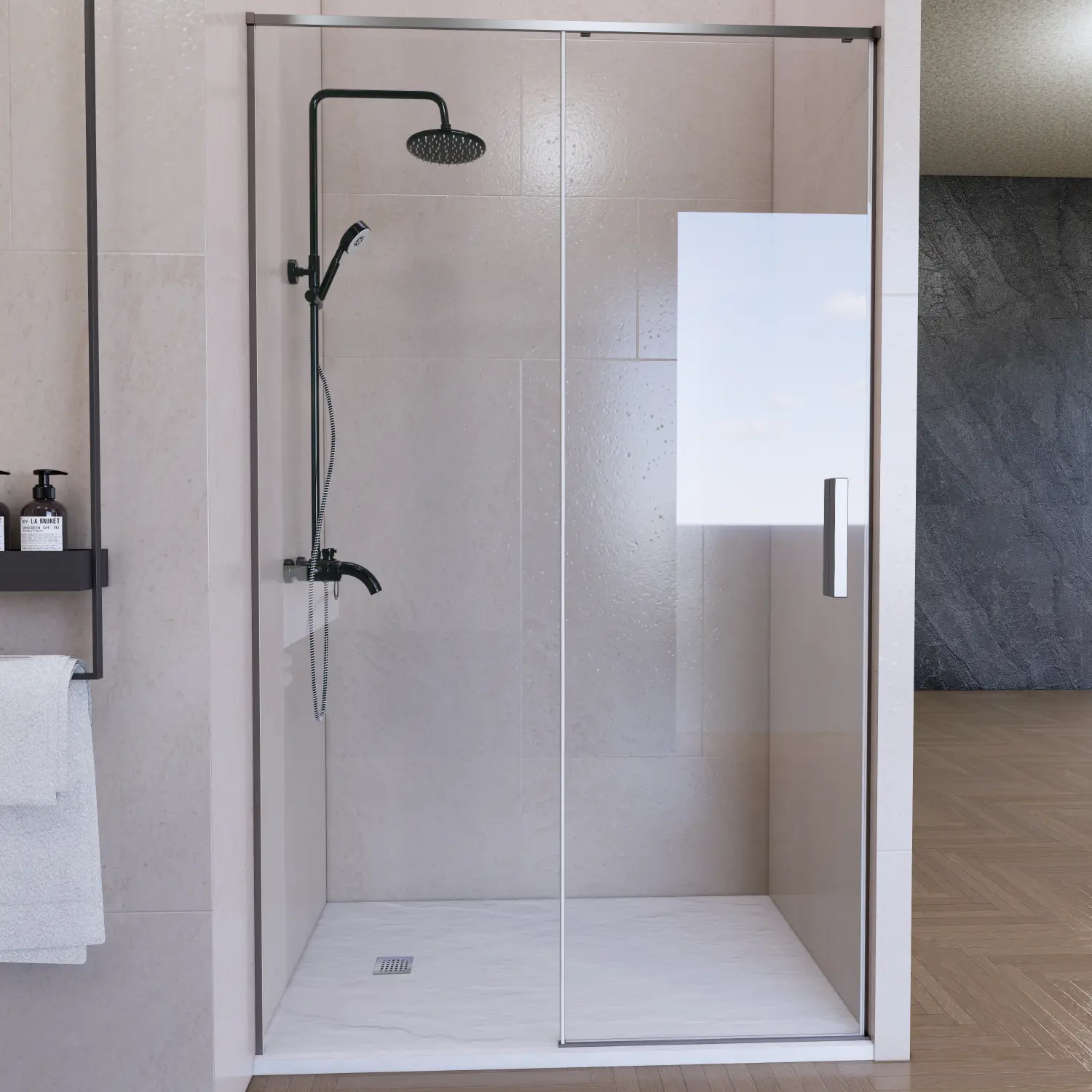 Renueva tu baño con esta elegante mampara frontal, formada por una hoja fija y una puerta corredera, que combina estilo, seguridad y máxima comodidad.