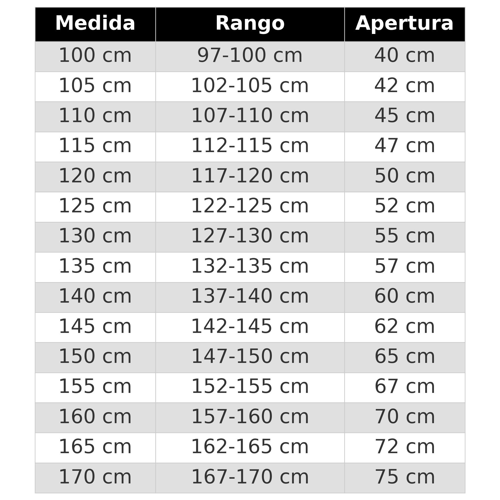 • Medidas: De 100 hasta 170, de 5cm en 5cm (100, 105, 110, 115…)