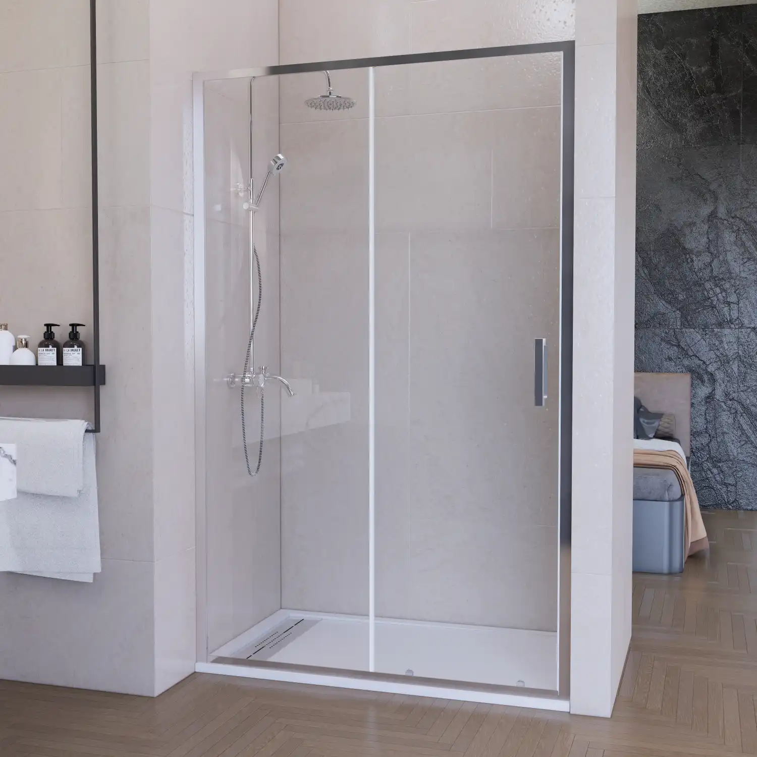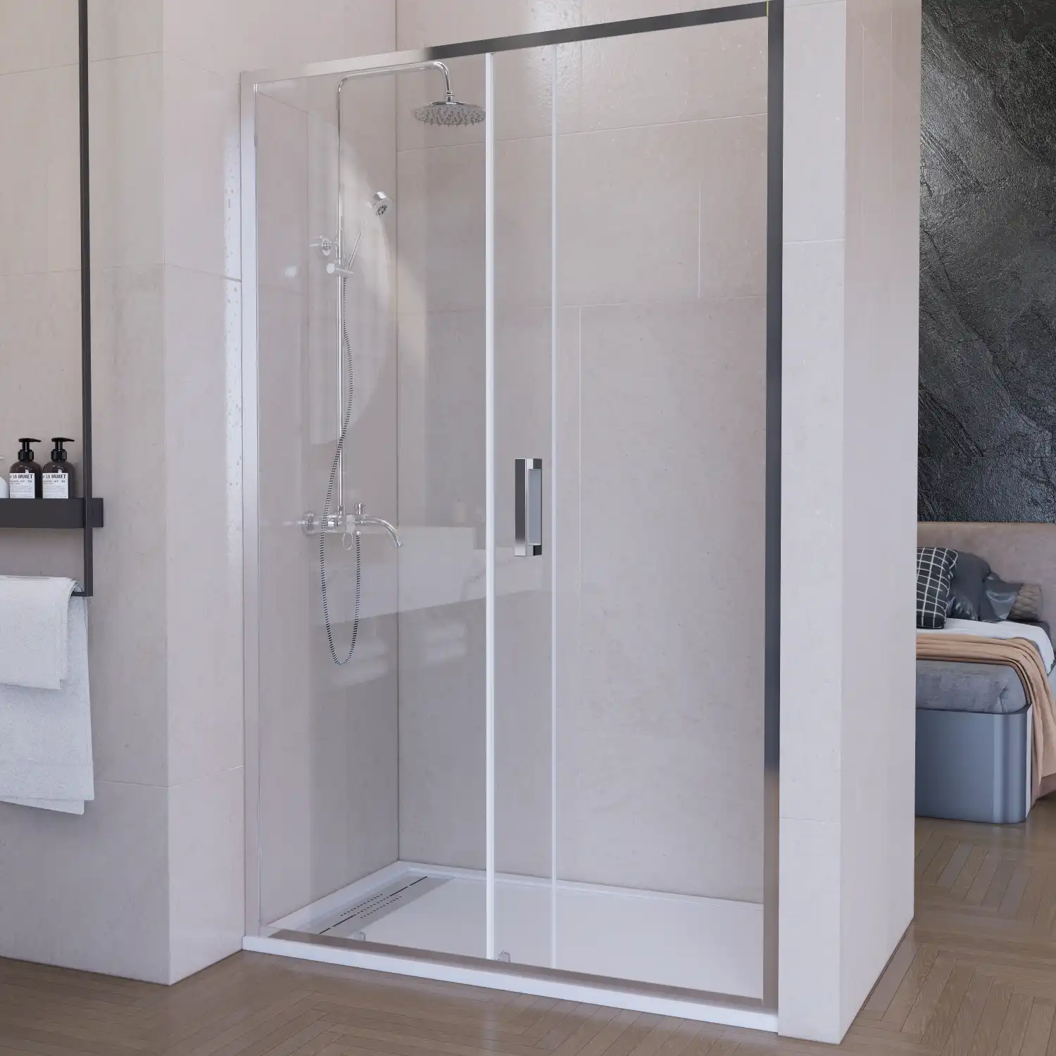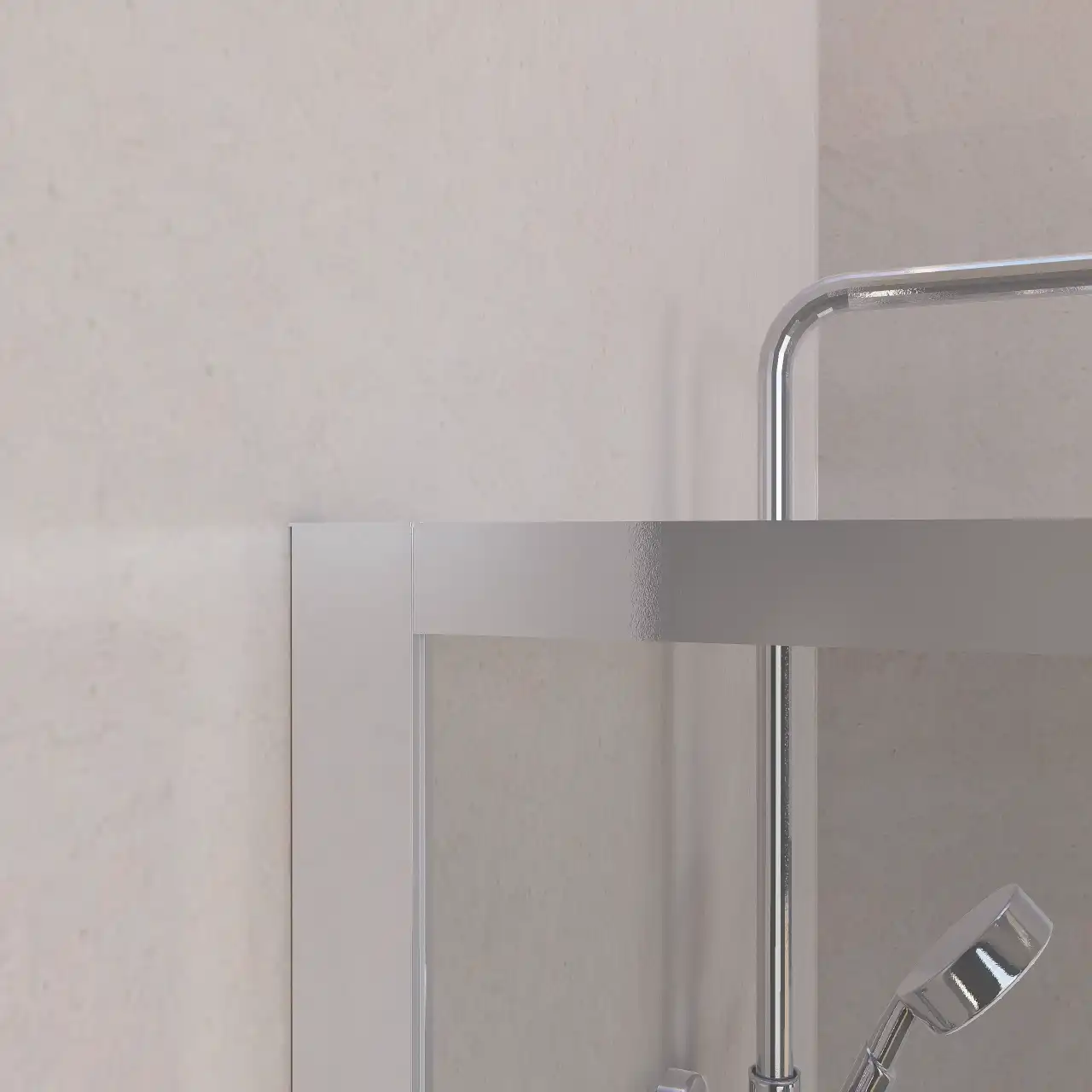 Esta mampara frontal está compuesta por una hoja fija y una puerta corredera, con perfil inferior que refuerza la estructura y asegura una mayor estanqueidad.
