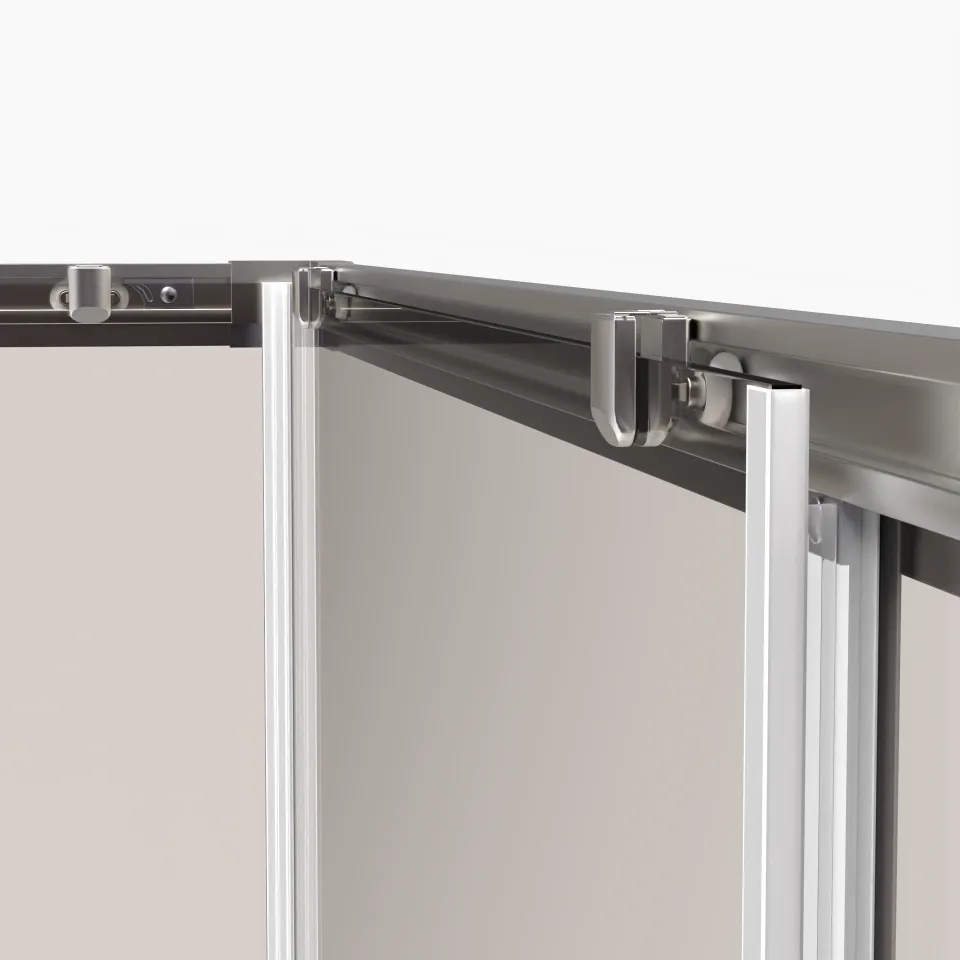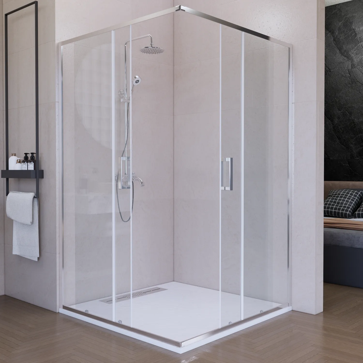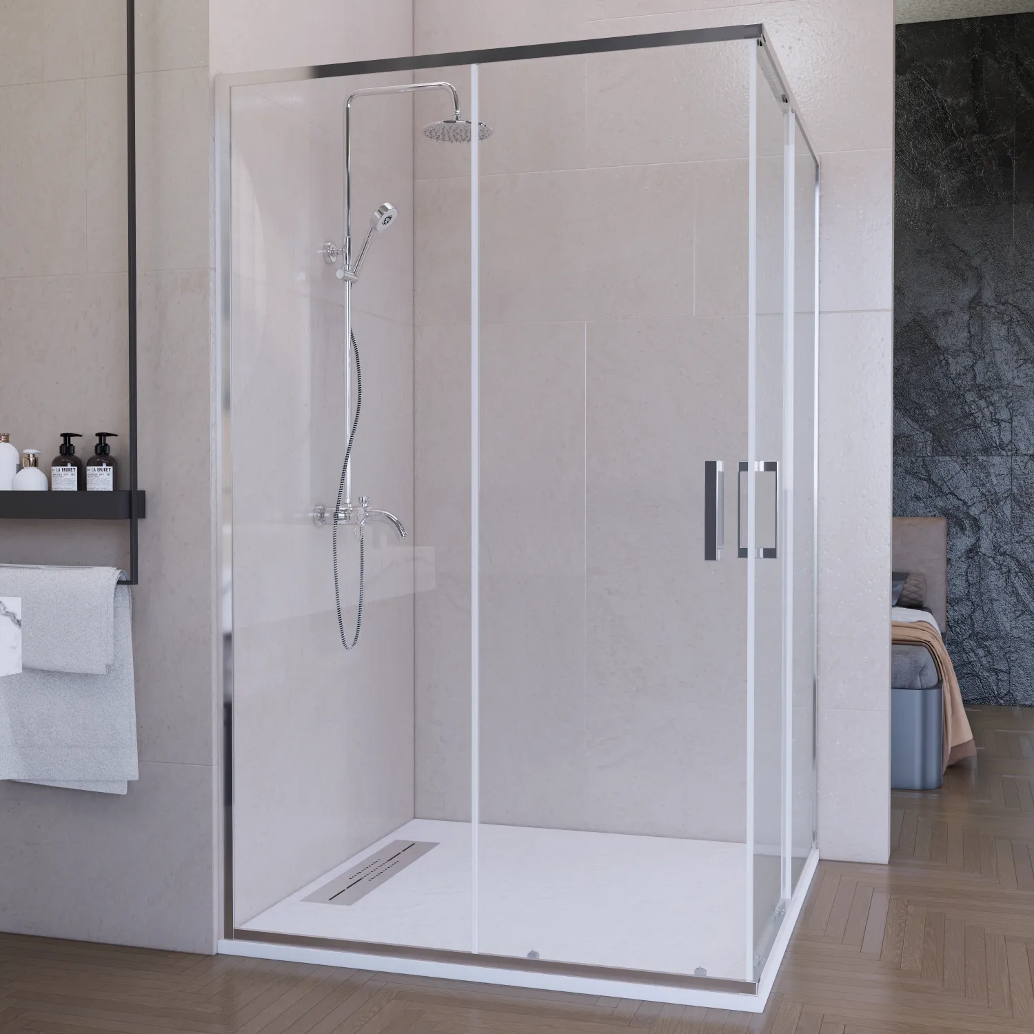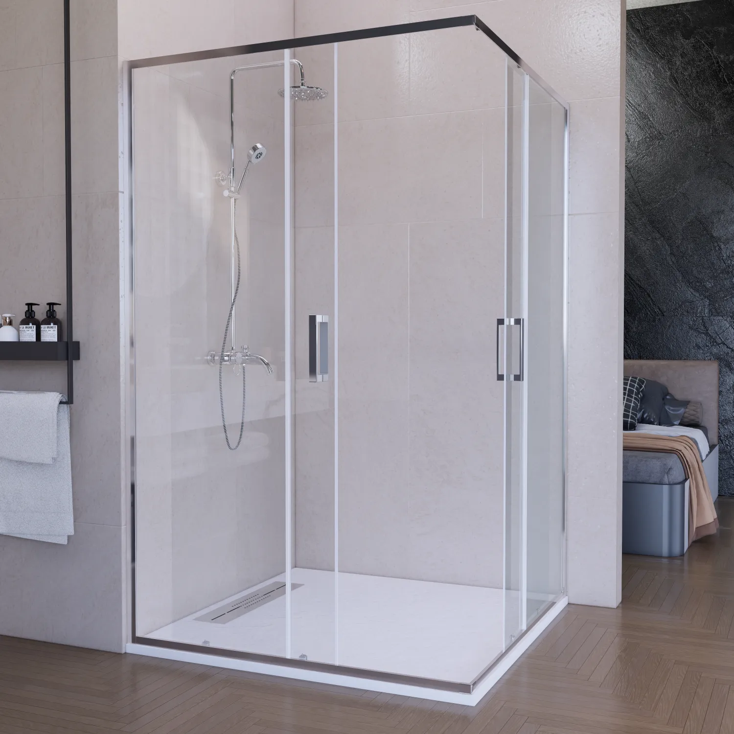 El vidrio templado de seguridad de 6 mm asegura estabilidad y resistencia para el uso diario. Las puertas correderas con sistema de rodamientos dobles metálicos y ruedas de nylon permiten un deslizamiento suave y silencioso. El cierre magnético garantiza estanqueidad y, junto al perfil inferior, impide que el agua se escape, aumentando la solidez y la durabilidad de la mampara.