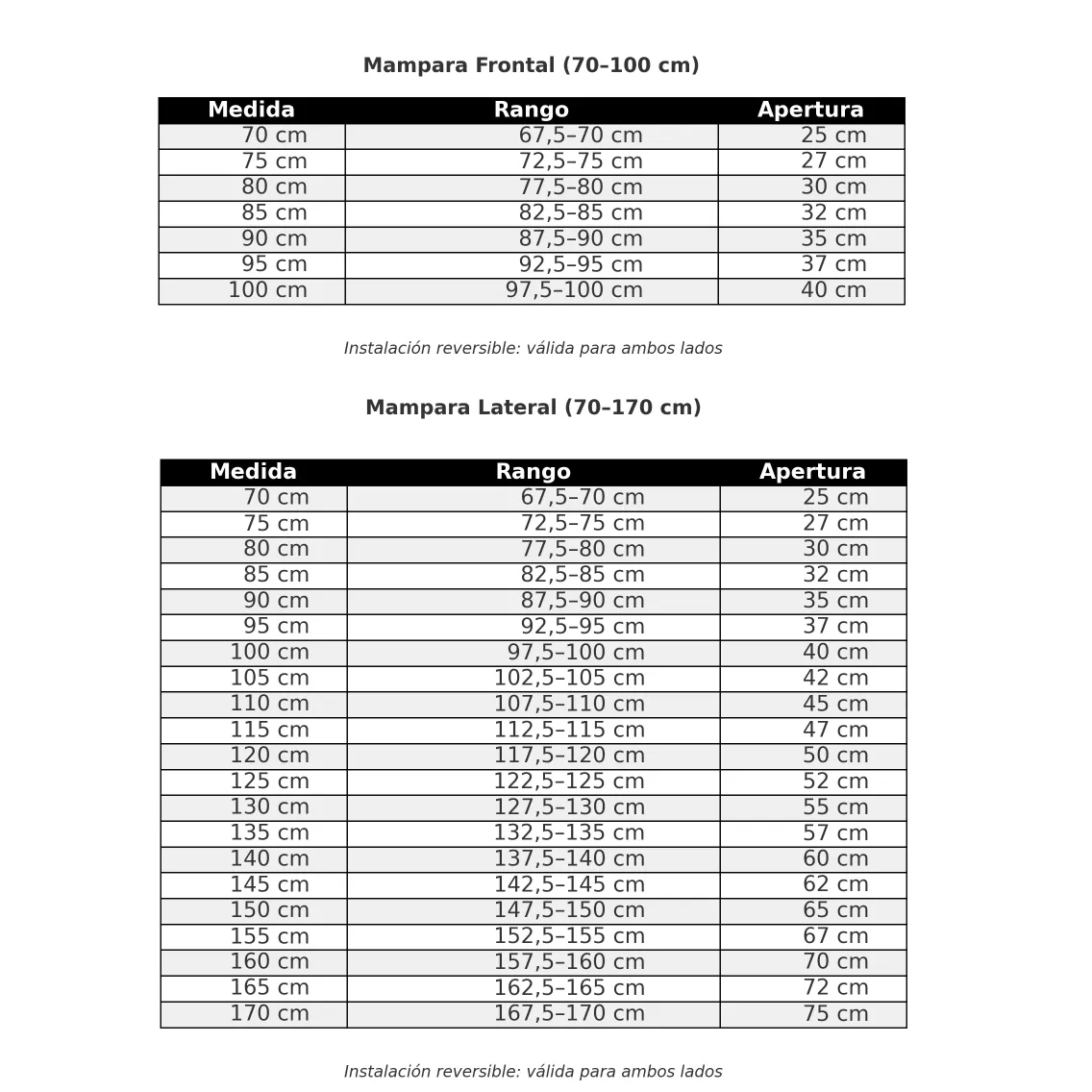 Medidas: Frontal desde 70 hasta 100 cm y lateral desde 70 hasta 170 cm. (En intervalos de 5 en 5)