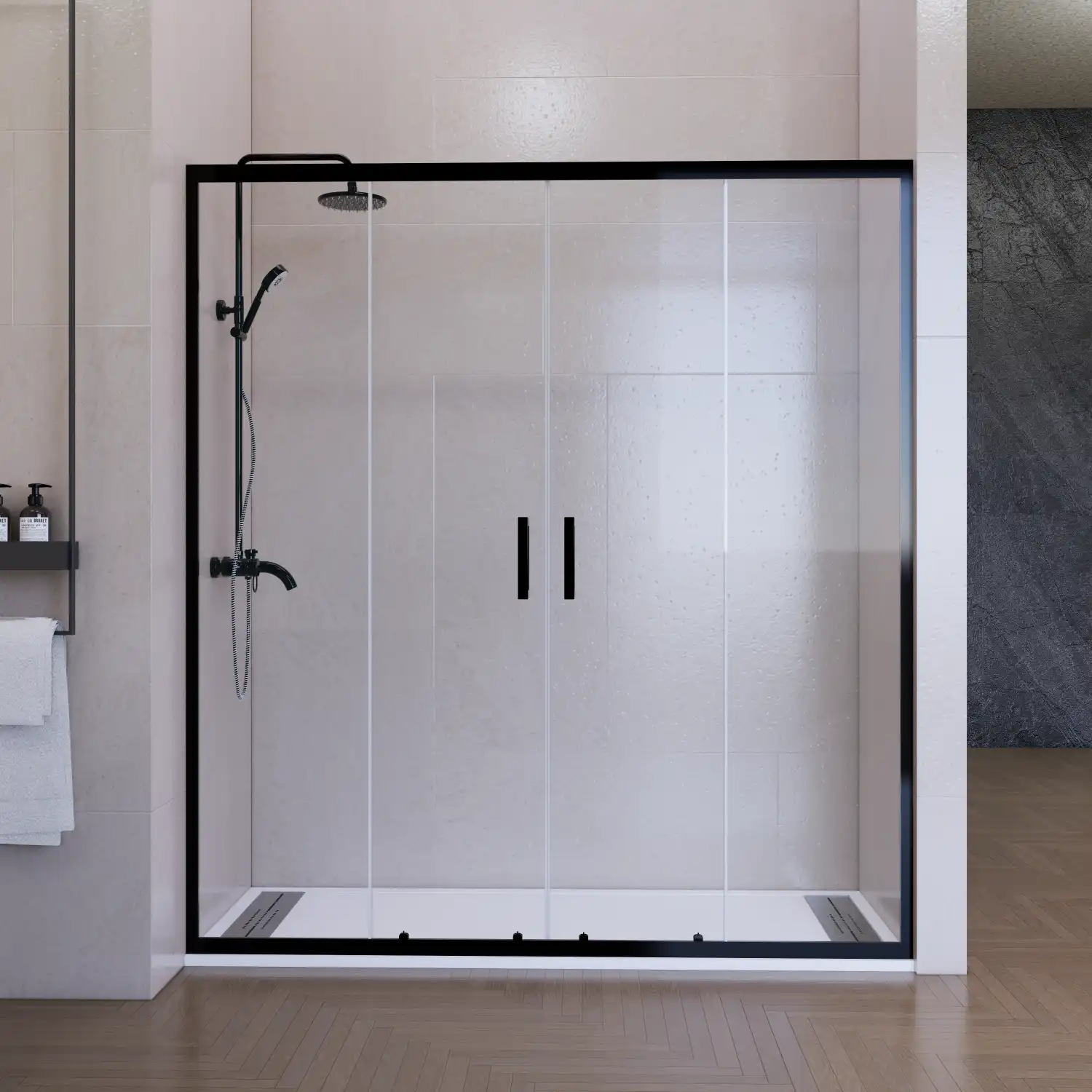 Renueva tu baño con este completo pack que incluye una mampara frontal corredera con 2 puertas correderas y 2 paneles fijos, perfilería en acabado negro mate y un plato de ducha de resina extraplano con textura pizarra en color blanco. Combinamos diseño moderno, máxima funcionalidad y materiales de alta calidad en una solución práctica y elegante.