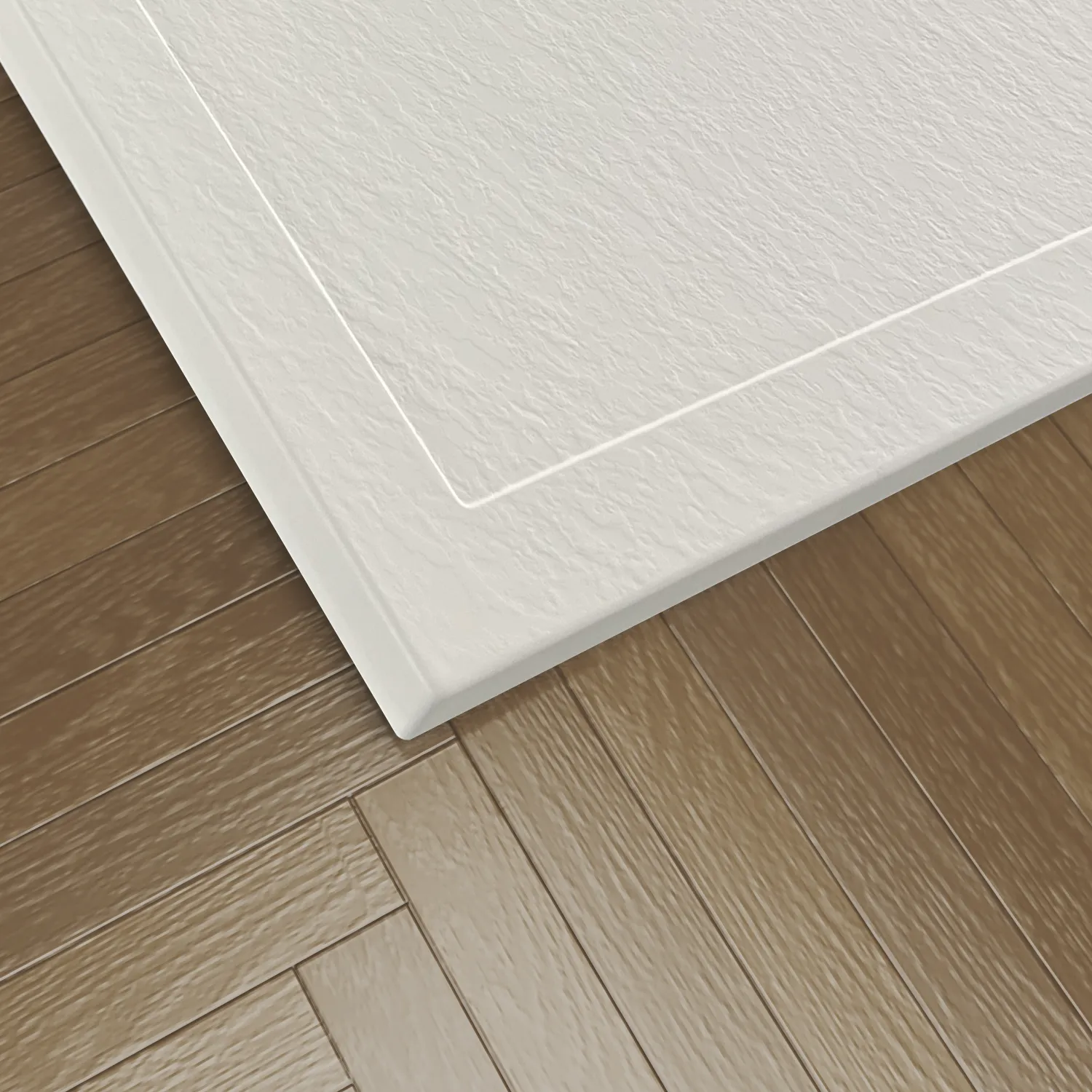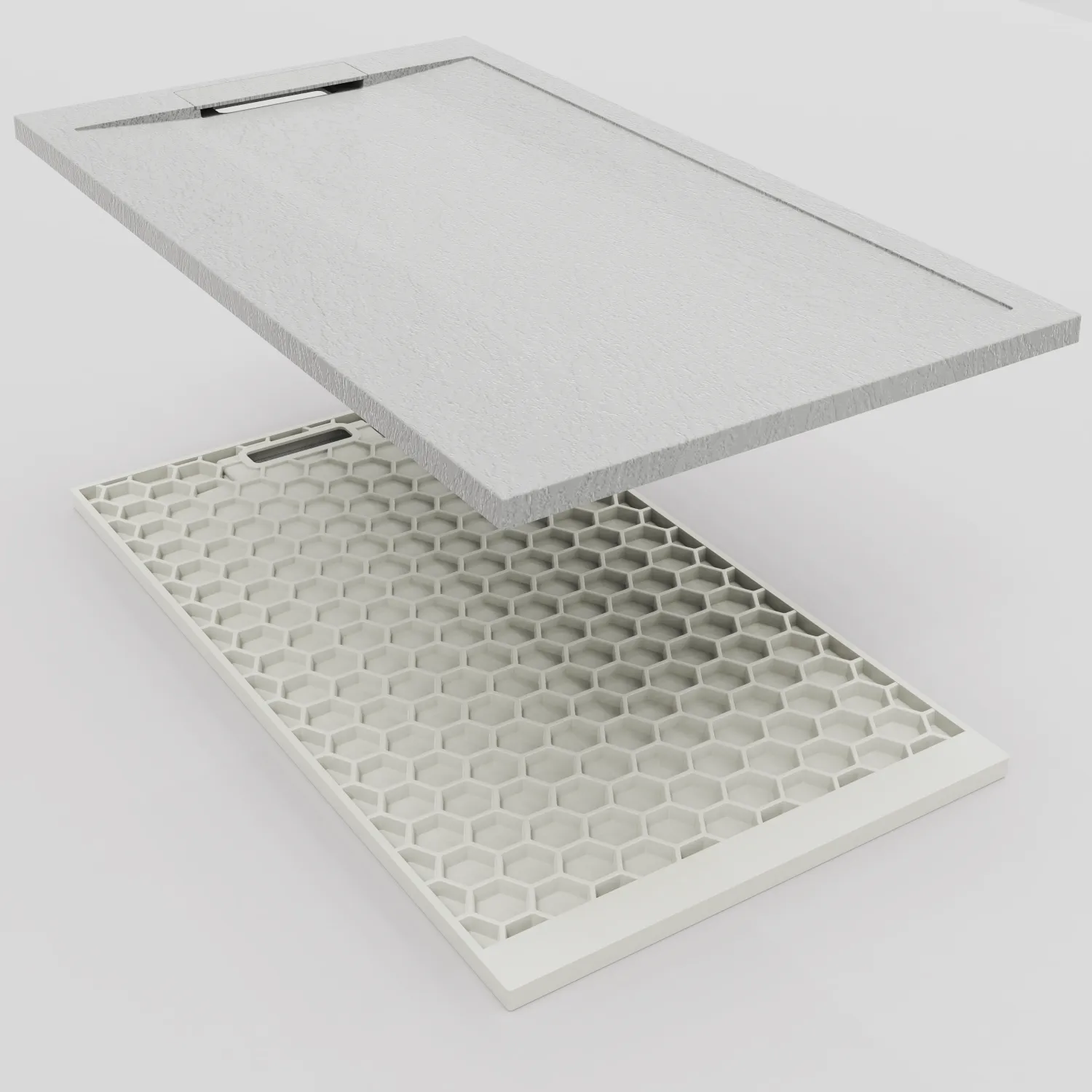Plato de ducha de líneas rectas con textura pizarra en blanco RAL 9003, pensado para integrarse en cualquier baño moderno. Destaca su estructura en panal de abeja en la parte inferior, que aporta gran resistencia y dureza manteniendo un peso muy contenido para una manipulación más cómoda.